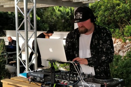 DJ with lighting set up behind